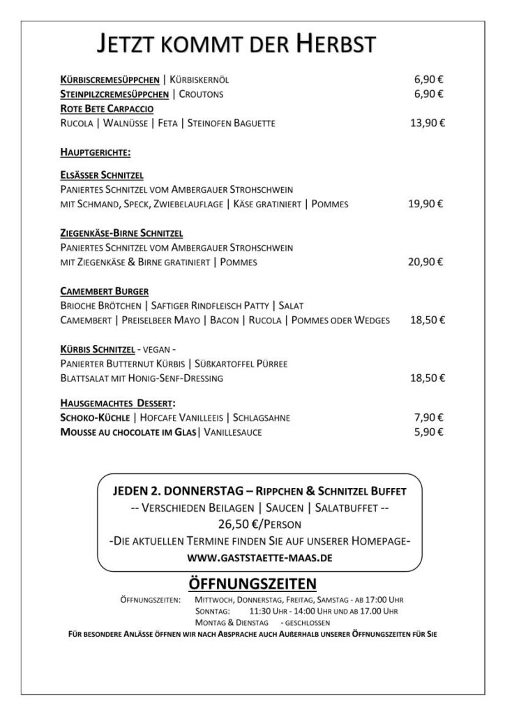 Die Gaststätte Maas ist ein Ort, an dem Tradition großgeschrieben wird. Seit unserer Gründung vor über 6 Jahrzehnten haben wir es uns zur Aufgabe gemacht, die authentische deutsche Küche zu bewahren und weiterzuentwickeln. Unsere langjährige Erfahrung spiegelt sich in jedem Gericht wider, das wir servieren.