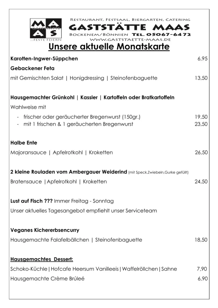 Willkommen in der Gaststätte Maas, dem Geheimtipp in Bockenem für Liebhaber der traditionellen deutschen Küche. Seit über 65 Jahren steht unser Familienbetrieb für kulinarische Exzellenz, wobei wir stolz auf unsere Verwendung von frischen, lokalen Produkten aus der malerischen Region Ambergau sind. Erleben Sie bei uns eine herzliche Gastfreundschaft und Gerichte, die mit Liebe und Sorgfalt zubereitet werden.
